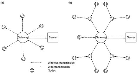 For a simple understanding, I just define the wireless sensor network herein includes three main items such as nodes, gateway, and server. Node has a microcontroller board as well as a radio and may or may not have a sensor that is typically powered by the battery. A gateway is a bridge between nodes and the server which functions to send and receive information to the node and server. The gateway communicates with the nodes through the LoRa radio while to the server through higher bandwidth communication protocols like wifi, ethernet, or cellular. The server is the controlling system that connects the gateways to deliver/present the data. Figure below shows the relationship among the nodes, gateway, and server that the nodes can be connected to the gateway by either using star-topology or mesh topology configurations. As illustrated in Figure a, the nodes communicate to the gateway directly while, as shown in Figure b, the nodes are connected to one another as well as the gateway. The gateway acts as a data sink that receives the data from the nodes, in the meantime, the server accesses the gateway by using a variety of internet communication options as mentioned above. Since the power consumption is the primary issue for the wireless sensor network, it depends on the project application to choose the types of configuration in order to save the battery power. For example, if the nodes are installed closely with each other and there are obstacles between nodes and gateway, the mesh topology configuration is a good choice. However, when the gateway is placed in the center among nodes and there are no obstacles between them, the star-topology could be chosen. In this project, the star-topology network configuration was selected.