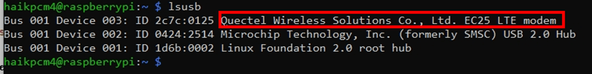 Send the AT command AT+QCFG=”usbnet” and verify that it returns 0. If it returns 1, send AT+QCFG=”usbnet”,0 and then AT+CFUN=1,1 to reboot the module after 10 seconds. Please note this step should be performed on a PC via Qnavigator. - Check the connection between 4G module and Raspberry Pi.