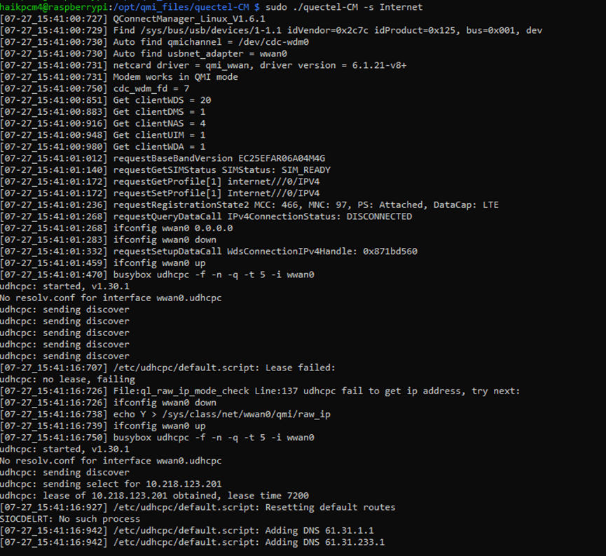 - Use the command sudo ./quectel-CM -s <YOUR APN> to establish the Internet connection.